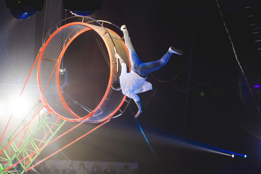 Это действительно потрясающее представление. Давно не была на таком. Очень всем рекомендую. Но слишком страшно за ребят, которые бегают по подвешенной, вращающейся конструкции. Советую всем посетить.